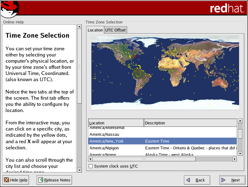 To change your time zone configuration after you have completed the installation, use the Time and Date Properties Tool. Type the redhat-config-date command in a shell prompt to launch the Time and Date Properties Tool. If you are not root, it prompts you for the root password to continue. To run the Time and Date Properties Tool as a text-based application, use the command timeconfig. |
