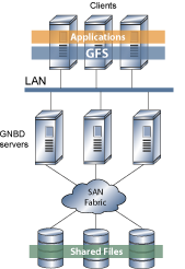 Multiple Linux client applications on a LAN can share the same SAN-based data as shown in Figure 1-2. SAN block storage is presented to network clients as block storage devices by GNBD servers. From the perspective of a client application, storage is accessed as if it were directly attached to the server in which the application is running. Stored data is actually on the SAN. Storage devices and data can be equally shared by network client applications. File locking and sharing functions are handled by GFS for each network client.